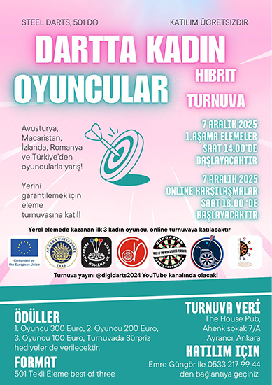 Erasmus spor projesi kapsamında devam eden Digidarts projesinin uluslararası online kadın turnuvası düzenlmektedir. Turnuva 2 aşamalı olacaktır. İlk aşamada yerel eleme maçları yapılacaktır. Dereceye giren 3 kadın oyuncu, uluslararası online turnuvaya girmeye hak kazanacaktır. Tüm kadın oyuncularımız turnuvaya özel olarak davetlidir. Şimdiden herkese iyi eğlenceler ve başarılar.